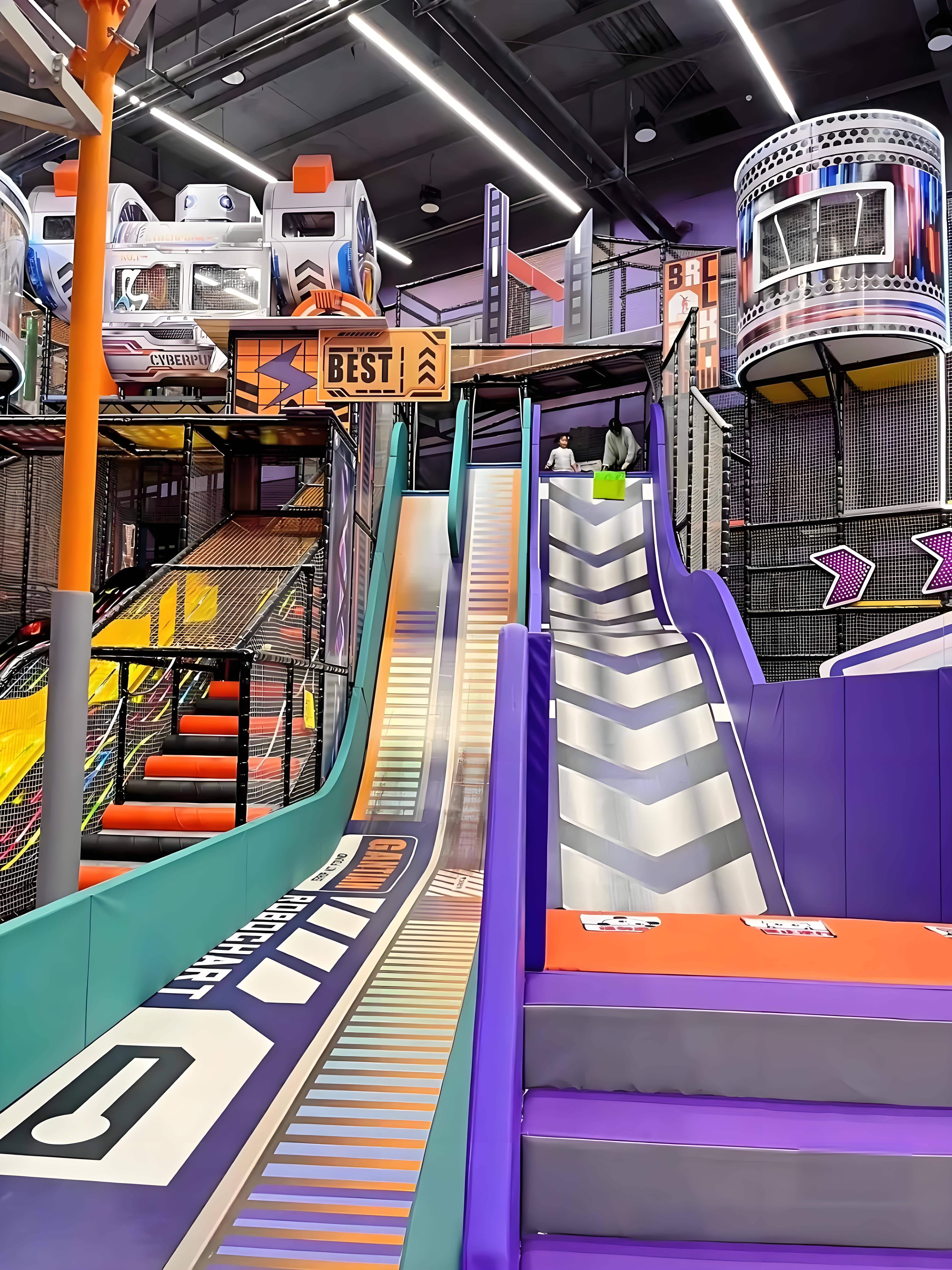 与传统淘气堡“儿童专属”的定位不同,弹力迷宫通过多维度玩法设计,让大人也能乐在其中。迷宫内穿插的刺激滑梯是亲子互动的“催化剂”:家长与孩子手拉手从高速滑道俯冲而下,笑声与尖叫交织成最温暖的陪伴记忆。此外,迷宫的立体结构天然适合“协作探险”——父母可以指导孩子规划路线,或一起完成“穿越障碍”挑战。这种“共同闯关”的体验,不仅拉近了亲子距离,更让运动馆成为家庭情感升温的“第三空间”。