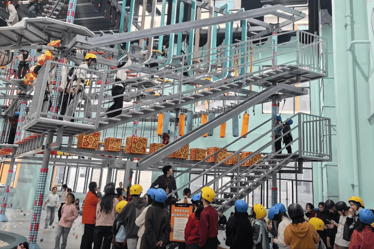 - 潮流运动区:采用工业风设计,搭配霓虹灯光,营造出时尚酷炫的氛围。高空无动力区采用透明防护网,既保证了游客的安全,又提升了视觉通透性,让游客能够充分体验“高空探险”的刺激感。